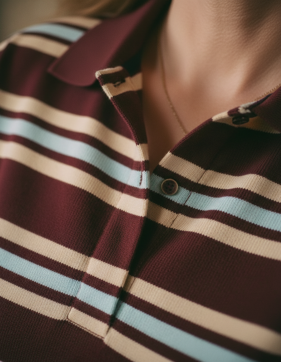 • Classic turn-down polo collar adds a refined, vintage-inspired touch.
